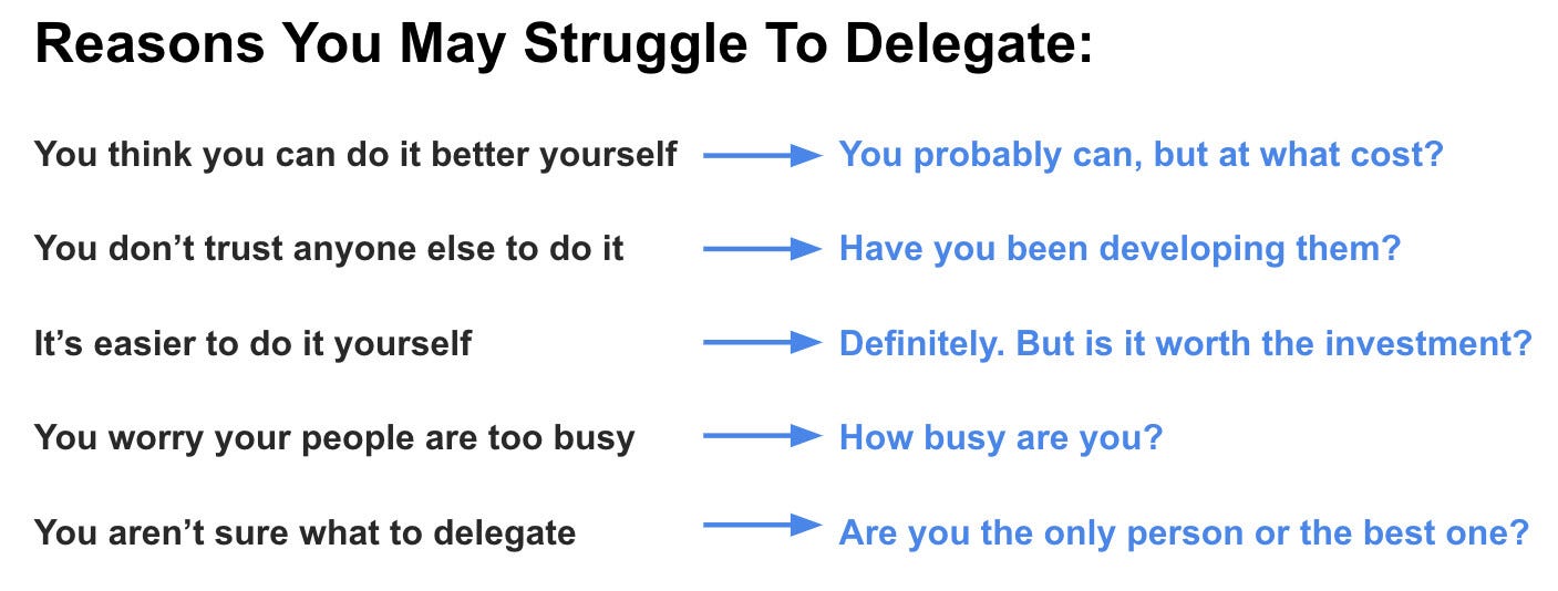 There are many reasons why you may struggle to delegate certain tasks. I’ve listed five common reasons below, along with a short rebuttal or reframe of each.
